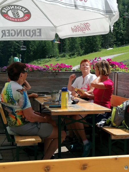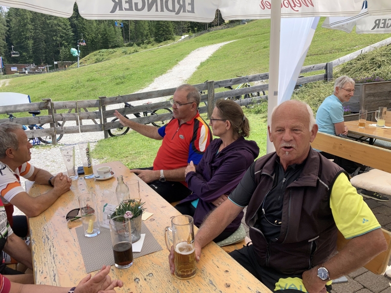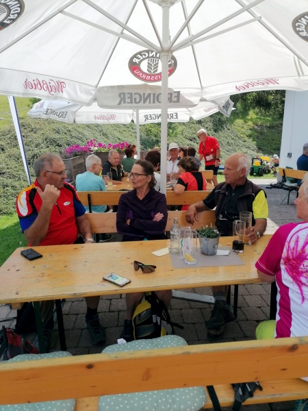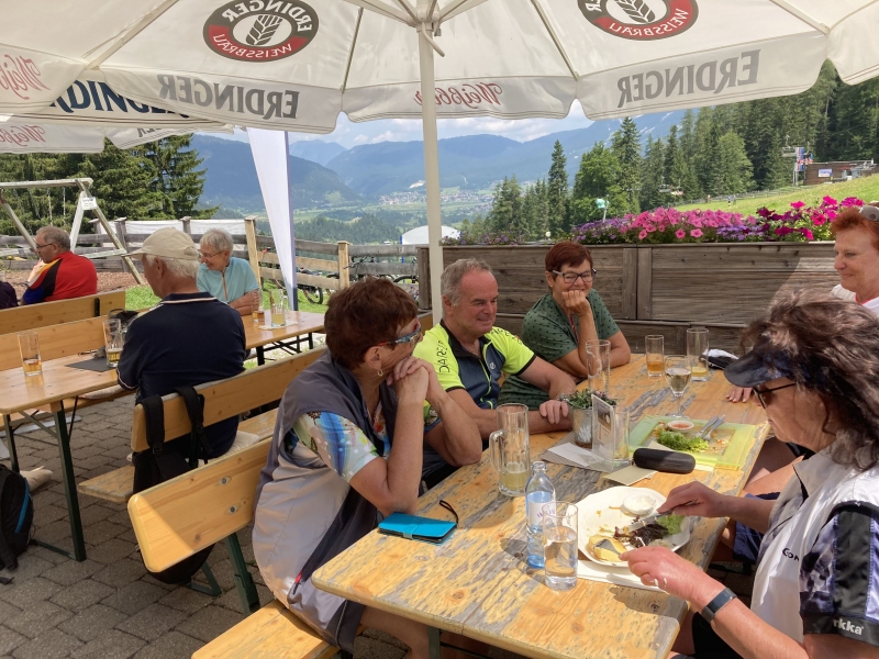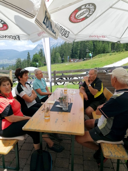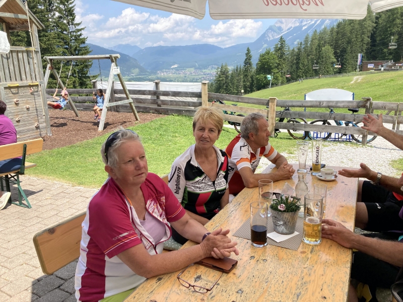 Als Ersatz machten sich am Donnerstag, dem 22. Juli 2021 die 22 Radlerinnen und Radler des PVÖ Weißenbach am Lech mit einigen Freundinnen und Freunden aus dem Talkessel Reutte auf den Weg über den Klausenwald – Heiterwang – Bichlbach – Biberwier zum „Waldhaus Talblick“ (Nähe Marienberglift). Dort aßen wir gemütlich zu Mittag  und genossen das herrliche Sommerwetter und den überwältigenden Ausblick auf das Wettersteinmassiv mit der Zugspitze.